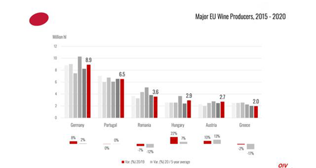 其他歐盟大型葡萄酒生產(chǎn)國(guó)與2019年相比也出現(xiàn)了正增長(zhǎng),如德國(guó)(8.9 mhl, +8%/2019)、匈牙利(2.9 mhl,+22%/2019)和奧地利(2.7 mhl, +10%/2019)。