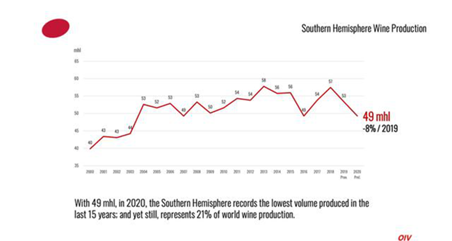 2020年,南半球的產(chǎn)量為49 億升(mhl),為過(guò)去15年的最低水平,仍占全球葡萄酒產(chǎn)量的21%。