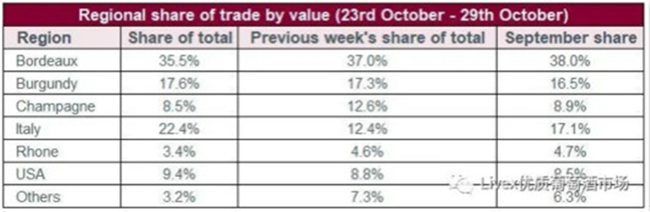 就Liv-ex上的交易總值份額而言,波爾多仍是最高(35.5%),但自年初以來(lái)(54.5%)已跌了很多。意大利保持在本年的平均水平(22.4%);美國(guó)創(chuàng)10月份新高(9.4%)。勃艮第也保持穩(wěn)定;而香檳(8.5%)、羅納(3.4%)和其它酒區(qū)(3.2%)則有回落。