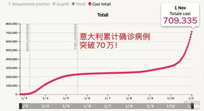 據(jù)意大利衛(wèi)生部11月1日公布的最新統(tǒng)計(jì)數(shù)據(jù),過(guò)去24小時(shí)意大利全國(guó)新增新冠病毒感染病例29907例,累計(jì)感染709335例;新增死亡208例,累計(jì)死亡38826例;累計(jì)治愈292380例,其中新治愈2954例。