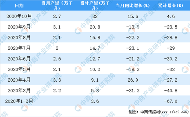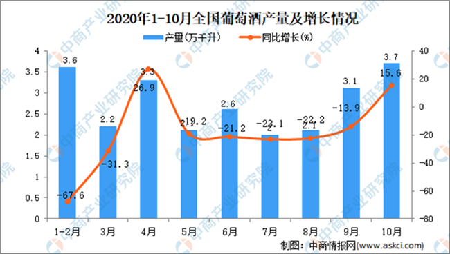 據(jù)中商產業(yè)研究院數(shù)據(jù)庫顯示,2020年10月全國葡萄酒產量增長,2020年10月全國葡萄酒產量為3.7萬千升,同比增長15.6%。2020年1-10月全國葡萄酒產量為32萬千升,同比增長4.6%。