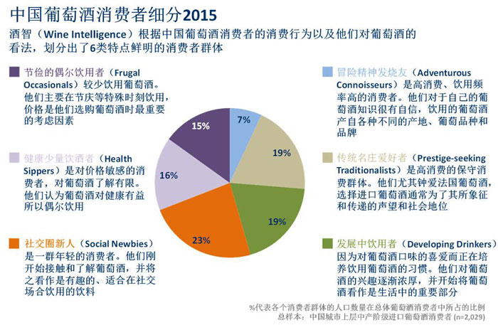 針對中國的3800萬進口葡萄酒消費者,酒智(Wine Intelligence)劃分出了6類特點鮮明的消費者類別。除了上述提及的 “發(fā)展中飲用者”(Developing Drinkers),其他5類包括“冒險精神發(fā)燒友”(Adventurous Connoisseurs)、“傳統(tǒng)名莊愛好者”(Prestige-seeking Traditionalists)、“社交圈新人”(Social Newbies)、“健康少量飲酒者”(Health Sippers)和“節(jié)儉的偶爾飲用者”(Frugal Occasionals)。酒智(Wine Intelligence)的消費者劃分不僅基于年齡、性別和收入等基本信息,還涉及消費者的購買飲用行為以及他們對于葡萄酒的看法,包括:他們?yōu)楹物嬘闷咸丫?,如何做出購買決定,以及飲用何種葡萄品種和產(chǎn)地等等。