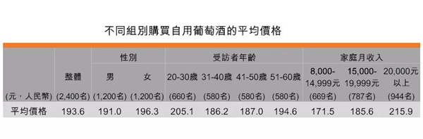 調(diào)查顯示,女受訪者購買自用葡萄酒的平均價(jià)格為196.3元,略高于男受訪者的191.0元。20-30歲消費(fèi)者容易接受較高價(jià)格的葡萄酒,因?yàn)樗麄冑徺I自用葡萄酒的平均價(jià)格為205.1元,相對其他年齡組別高。隨著家庭月收入上升,受訪者購買自用葡萄酒的價(jià)格也同時(shí)提高。