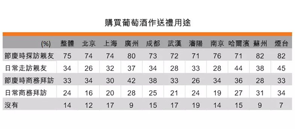 受訪城市中,蘇州及煙臺均有82%、廣州80%的受訪者表示在節(jié)慶探訪親友時(shí)曾購買葡萄酒作為送禮用途,高于75%整體平均比例。而煙臺和哈爾濱分別有45%和44%的受訪者在日常走訪親友時(shí)購買葡萄酒作為送禮用途,高于34%整體平均比例。