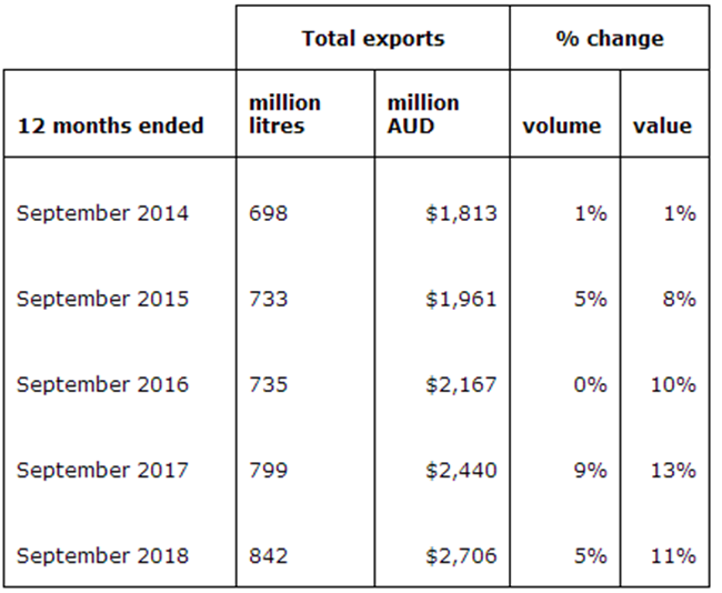 澳大利亞葡萄酒對(duì)全球出口額和出口總量持續(xù)走強(qiáng)。截止到2018年9月30日的一年中,澳大利亞葡萄酒出口總額增長(zhǎng)11%至27.1億澳元,出口總量增長(zhǎng)5%至8.42億升(或900萬(wàn)箱9升裝,見(jiàn)表2)。