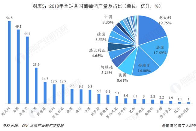 2018年,歐洲依然是全球最大的葡萄酒生產(chǎn)區(qū)域,總產(chǎn)量實(shí)現(xiàn)181.9億升,占比高達(dá)62%。世界排名前三的葡萄酒生產(chǎn)國依次是意大利(54.8億升)、法國(49.1億升)和西班牙(44.4億升),三者的產(chǎn)量總和超過了世界總產(chǎn)量的一半,達(dá)到51%。根據(jù)OIV的統(tǒng)計(jì)口徑,2018年中國葡萄酒產(chǎn)量為9.3億升,排名世界第十,全球占比3.35%。
