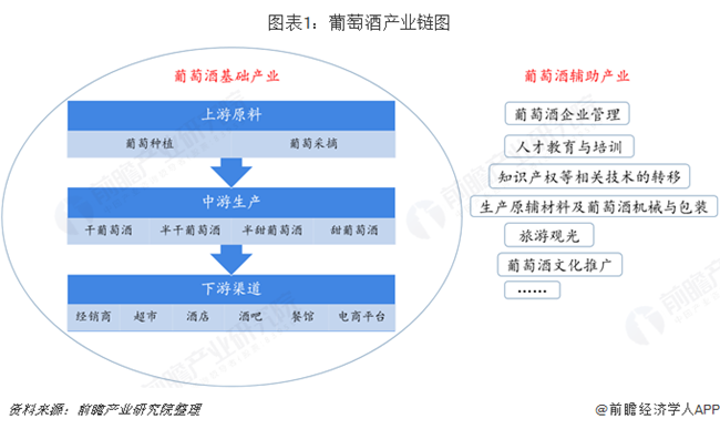 葡萄酒行業(yè)所處的產(chǎn)業(yè)鏈?zhǔn)怯善咸逊N植者、葡萄酒生產(chǎn)者、消費(fèi)者、資源回收者等一系列利益相關(guān)者組成,通過自種釀酒葡萄或者收購釀酒葡萄或葡萄原酒,對之進(jìn)行加工,之后銷售產(chǎn)成品。該系統(tǒng)以產(chǎn)區(qū)生態(tài)為條件,以葡萄種植為基礎(chǔ),以葡萄酒生產(chǎn)及其副產(chǎn)物資源利用為保證,涉及到相關(guān)的葡萄種植、葡萄酒釀造、葡萄酒包裝、零售賣場、餐飲行業(yè)、消費(fèi)者經(jīng)濟(jì)收入與消費(fèi)偏好等眾多環(huán)節(jié)。