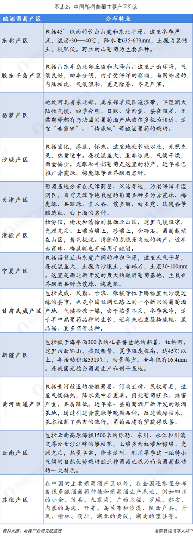 目前國內(nèi)主要的釀酒葡萄產(chǎn)區(qū)分布在華北地區(qū)、沿海一帶、新疆、甘肅等地,大面積的種植滿足了中國的葡萄酒產(chǎn)業(yè)基本的原料需求。釀酒葡萄一般分為白葡萄和紅葡萄兩種,這兩種葡萄更適合沿海地區(qū)的種植。釀酒葡萄一般在九月份成熟,因?yàn)閷λ忠筝^大,所以不適合西部地區(qū)東北地區(qū)種植,可以做鮮食,但不適合存儲。在中國北緯45°-25°廣闊的地域里,分布著各具特色的葡萄、葡萄酒產(chǎn)地。葡萄酒行業(yè)經(jīng)過多年的發(fā)展,逐步形成11個(gè)具有典型產(chǎn)地特征葡萄酒產(chǎn)區(qū)。