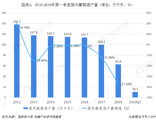 近幾年由于我國實(shí)行“三公”政策對葡萄酒行業(yè)發(fā)展造成一定負(fù)面影響,葡萄酒行業(yè)一直處于產(chǎn)業(yè)結(jié)構(gòu)調(diào)整時(shí)期。從國家統(tǒng)計(jì)局的數(shù)據(jù)看來,2012年我國葡萄酒產(chǎn)量一直處于下跌狀態(tài),2018年全國葡萄酒產(chǎn)量累計(jì)值為62.9萬千升,比2017年總產(chǎn)量的100.1萬千升減少了37.2萬千升,暴跌37.16%。
