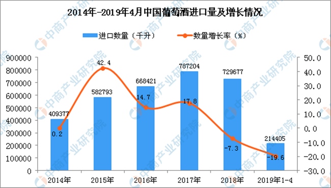 據(jù)中商產(chǎn)業(yè)研究院數(shù)據(jù)庫顯示,2013年-2017年中國葡萄酒進(jìn)口量增長,共增長381347千升,增長93.96%;2018年中國葡萄酒進(jìn)口量回落,2019年1-4月中國葡萄酒進(jìn)口量為214405千升,同比下降19.6%。