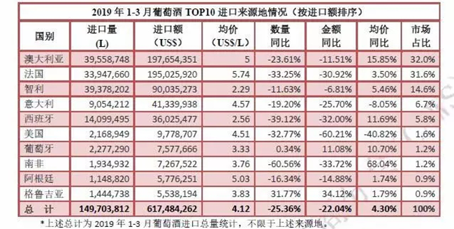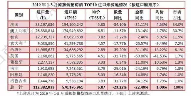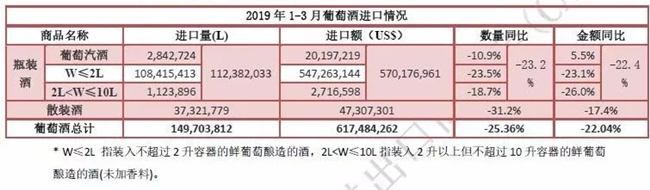 近日,中國食品土畜進(jìn)出口商會酒類進(jìn)出口商分會發(fā)布2019年一季度酒類進(jìn)口統(tǒng)計報告。報告顯示,一季度,進(jìn)口酒類市場整體呈下行態(tài)勢,且降幅仍在擴大。其中,葡萄酒進(jìn)口延續(xù)跌勢,量額跌幅均逾兩成。進(jìn)口量1.5億升,進(jìn)口額6.2億美元,約占酒類進(jìn)口總額的55.4%。