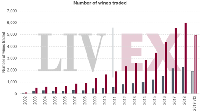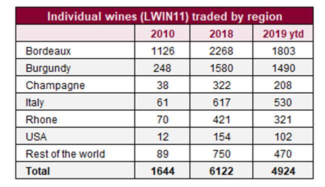 本年至今,已有4924款不同的葡萄酒(包括不同年份)出現(xiàn)交易。它們來自多個(gè)不同酒區(qū),包括英國、中國和黎巴嫩;盡管這些國家的交易數(shù)量不多。
