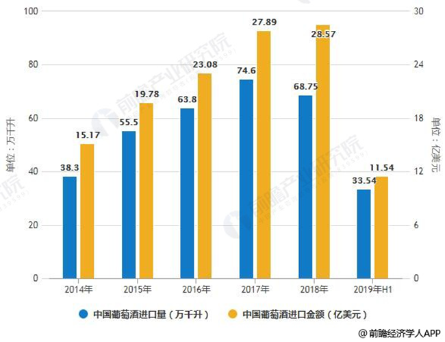 海關數據顯示,今年1-5月份,中國進口瓶裝葡萄酒總額為9.2億美元,同比下降21.4%,最新的6月份的進口數據有所回升,但今年前六個月的進口金額仍整體下滑了2成。截止至2018年進口葡萄酒總量為6.88億升,較去年同期下滑了8.26%。進口額略微上漲2.12%,達28.5億美元。截止至2019年1-6月中國葡萄酒進口量為335471千升,同比下降12.9%,中國葡萄酒進口金額為1154.1百萬美元,同比下降9.2%。