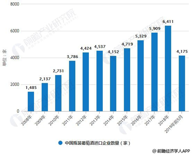 2008-2019年前5月中國瓶裝葡萄酒進口企業(yè)數量統(tǒng)計情況