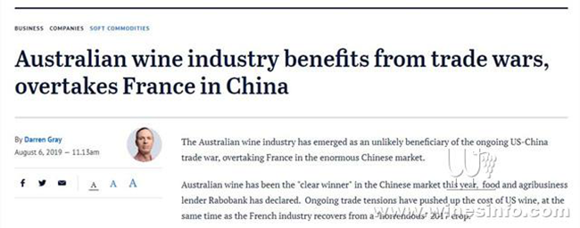 2018年澳洲對(duì)中國葡萄酒出口量上漲19.8%,且在2019年的前4個(gè)月中更是上漲了25.7%。(網(wǎng)頁截圖/《時(shí)代報(bào)》)