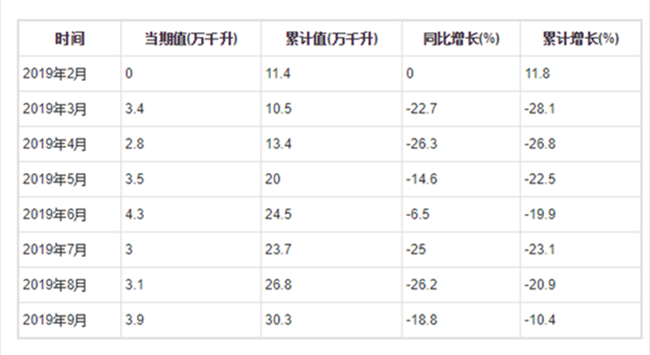 2019年9月全國葡萄酒產(chǎn)量為3.9萬千升,累計值為30.3萬千升,同比下降18.8%,累計下降10.4%。