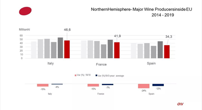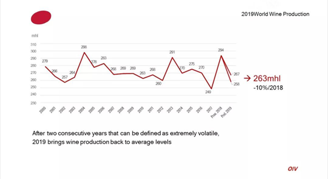 據(jù)國(guó)際葡萄與葡萄酒組織(OIV)最新數(shù)據(jù)顯示,2019年全球葡萄酒產(chǎn)量為263億升(mhl),同比2018年下降了10.54%。包括法國(guó)、意大利、西班牙在內(nèi)的葡萄酒主產(chǎn)國(guó)產(chǎn)量均有不同程度下降。OIV的數(shù)據(jù)來(lái)自28個(gè)國(guó)家,占全球葡萄酒產(chǎn)量的85%。