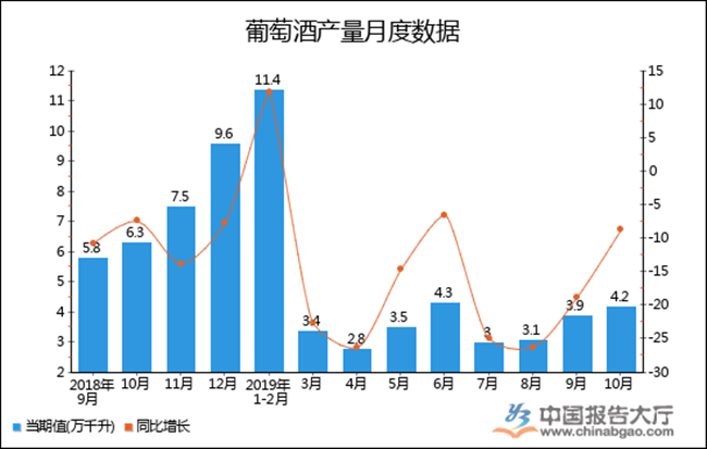 2019年10月全國葡萄酒產(chǎn)量為4.2萬千升,累計(jì)值為34.7萬千升,同比下降8.7%,累計(jì)下降10.1%。