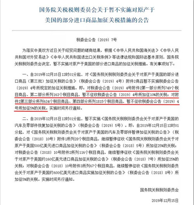 作為回應(yīng),中國將購買更多的美國農(nóng)產(chǎn)品,增加美國公司進入中國市場的機會。因此,中國國務(wù)院關(guān)稅稅改委員會發(fā)布公告,將暫停實施原計劃于 2019 年 12 月 15 日 12 時 01 分起實施的《國務(wù)院關(guān)稅稅則委員會關(guān)于對原產(chǎn)于美國的部分進口商品(第 3 批)加征關(guān)稅的公告》加征關(guān)稅措施。具體政策如下: