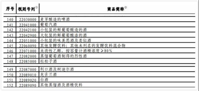 葡萄酒在內(nèi)的酒類商品作為美國重要的農(nóng)產(chǎn)品,就包含在《國務(wù)院關(guān)稅稅則委員會關(guān)于對原產(chǎn)于美國的部分進口商品(第 3 批)加征關(guān)稅的公告》(稅委會公告〔2019〕4 號)附件 2 第 1 部分商品內(nèi),因此可以免予在此前基礎(chǔ)上加征的 10% 關(guān)稅。具體包含內(nèi)容如下: