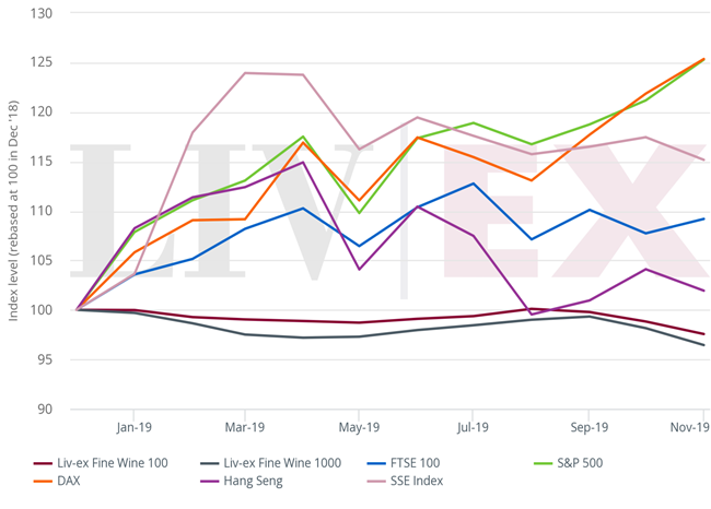 為了更好地反映優(yōu)質葡萄酒的表現(xiàn)情況,下圖將Liv-ex 100和Liv-ex 1000與全球股票進行比較。盡管優(yōu)質葡萄酒指數(shù)相對穩(wěn)定,但由于利率下調提高了投資者承受風險的意愿,使其表現(xiàn)仍遠遠落后于全球股市。恒生指數(shù)一向表現(xiàn)平平的香港,成為了優(yōu)質葡萄酒需求的主要來源。 事實上,自春季以來,該指數(shù)和上證綜合指數(shù)一直下跌。