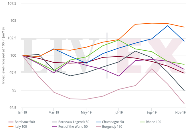 在所有分項指數(shù)中,只有香檳50和意大利100在2019年度出現(xiàn)正增長,分別上升2.2%和4.6%。在過去一年,由于這兩酒區(qū)的悠久歷史和品牌力量,以及一系列的出色年份和相對較低入市價格,日漸受酒評家和市場的高度關注,令它們交易增加和價格上升,表現(xiàn)勝于勃艮第和波爾多。事實上,香檳和意大利仍未包括在美國最近的新關稅葡萄酒之列,因而進一步受惠。