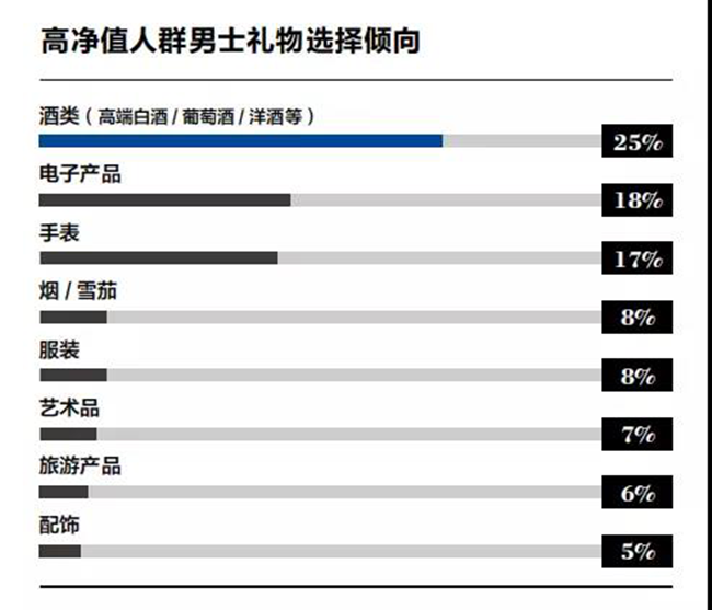 25%的高凈值男士喜歡選擇酒類作為禮物進(jìn)行贈(zèng)送。這種現(xiàn)象也反映在收藏領(lǐng)域。