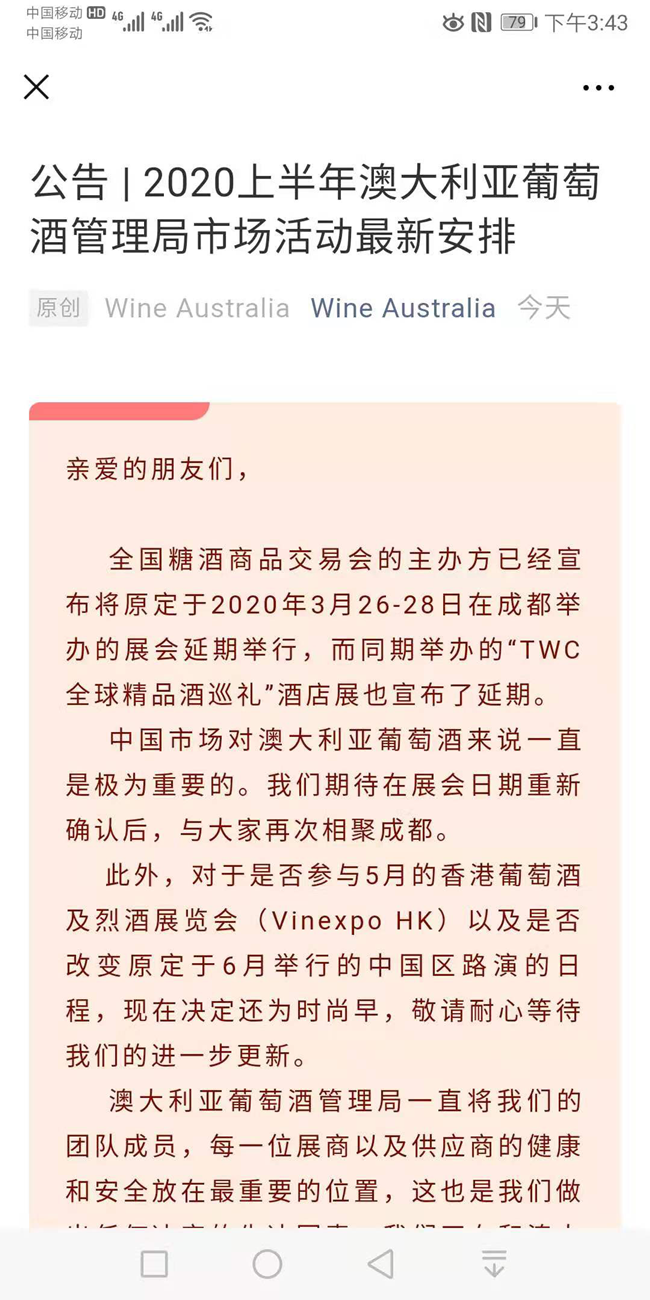 2月5日,澳大利亞葡萄酒管理局市場部總經(jīng)理Stuart Barclay在一份公告中表示,中國市場對澳大利亞葡萄酒來說一直是極為重要的。“我們期待在展會日期重新確認(rèn)后,與大家再次相聚成都。”