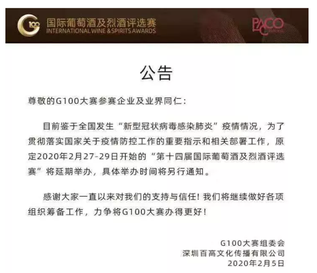 日前,G100大賽組委會(huì)以及深圳百高文化傳播有限公司發(fā)出公告,原定于在2月27-29日開始的“第十四屆國際葡萄酒及烈酒評(píng)選賽”也將延期舉辦,具體舉辦時(shí)間將另行通知。