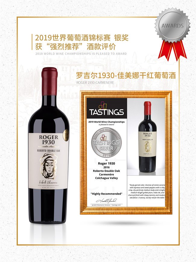 羅吉爾1930-羅伯特紅葡萄酒呈深邃的寶石紅色;酒香非常柔和,伴有精致的黑加侖,黑李子的果香以及甘草、煙熏的香氣;口感優(yōu)雅豐富,層次鮮明且多變,單寧強勁,令人十分愉悅。在榮獲2020柏林葡萄酒大獎賽金獎的榮譽之前,就已經(jīng)獲得了2019世界葡萄酒錦標賽金獎的榮譽,以及“無與倫比”酒款評價!
