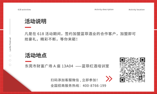 “618”購物狂歡節(jié)是與‘雙11’遙相呼應(yīng)的一個全民網(wǎng)購狂歡節(jié),現(xiàn)已逐漸成為線上線下綜合的全民購物狂歡節(jié)。為迎接618狂歡慶典的到來,藍菲特舉辦“藍菲618,我要發(fā)”系列活動,惠饋我們新簽約合作的加盟商/代理商們,與我們共建紅酒事業(yè)。