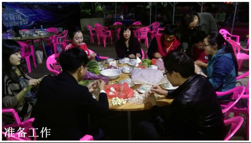 25號當天,負責采購的同事根據(jù)大家寫好的菜單,提前采購好所需要的雞、鴨、魚、肉、蔬菜等各色原料,以及油鹽醬醋等各種調(diào)味品,開始做好活動前的各項準備工作。當天下午5點,大家在公司領(lǐng)導莊總、劉總、曾總的帶領(lǐng)下,陸續(xù)到達活動現(xiàn)場——位于南城水濂山腳下順風山莊內(nèi)的蒙之味烤全羊原生態(tài)KTV燒烤廣場。