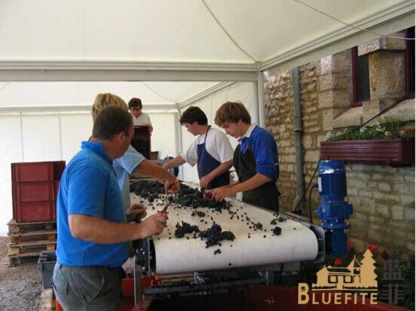 相對(duì)于快速便捷的機(jī)器采摘,人工采摘是一種速度較慢又耗費(fèi)人力的工作,但是卻能最大限度保護(hù)葡萄藤、保證葡萄的完好品質(zhì),因?yàn)楹玫钠咸丫茖?duì)葡萄串(包括顏色、大小、成熟度、飽滿度)的要求很高,人工采摘可以對(duì)葡萄進(jìn)行篩選——將成熟或不成熟、健康或染病的葡萄區(qū)分開來。當(dāng)然,人工采摘也會(huì)產(chǎn)生少量的損耗,當(dāng)葡萄被整串整串采收時(shí),容易導(dǎo)致下面的部門葡萄受到擠壓。藍(lán)菲酒莊內(nèi)精品老葡萄藤及其他珍貴的葡萄品種(如貴腐等),以及生長在山地上的葡萄園均采用人工采摘法采收葡萄。