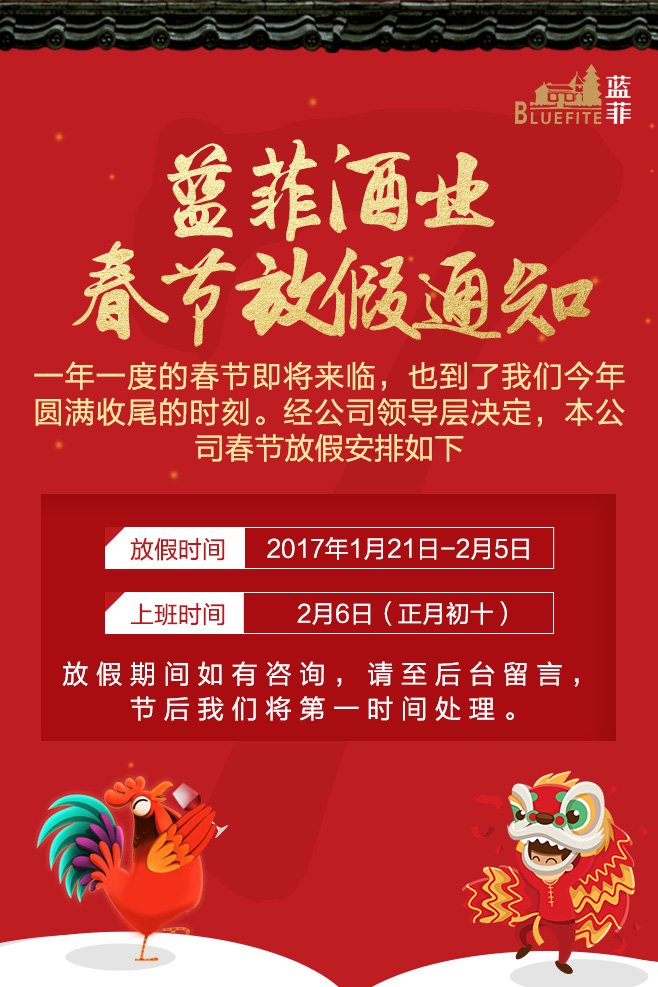 值此2017新春佳節(jié)即將到來之際,藍菲酒業(yè)全體員工恭祝您和您的家人:闔家幸福,吉祥安康!2017更加輝煌!