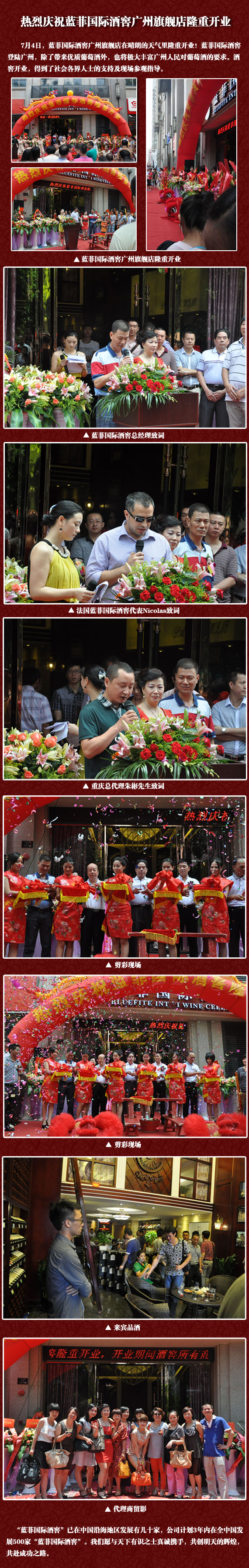 7月4日,藍(lán)菲國際酒窖廣州旗艦店在晴朗的天氣里隆重開業(yè)!藍(lán)菲國際酒窖登陸廣州,除了帶來優(yōu)質(zhì)葡萄酒外,也將極大豐富廣州人民對(duì)葡萄酒的要求。酒窖開業(yè),得到了社會(huì)各界人士的支持及現(xiàn)場(chǎng)參觀指導(dǎo)。